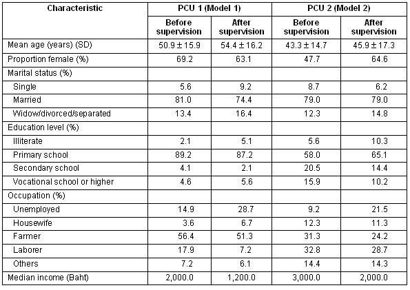 The success of both participatory supervisory models in this study may be due to the strong support of the supervisors at Chiang Mai provincial level, and the mutual benefits to the staff and the research team. In the present study, supervisory model 2 appeared more successful than model 1. There may be several explanations for this. In model 2, the community had the opportunity to give critical advice to health officers that had never been offered before. The participation of the community was empowering13. By enhancing knowledge, skills and experiences, the community became more responsible for its own development14-16. The process of equal participation, without discrimination according to social status, strengthened the community and promoted greater participation17. The benefits of participation decreased reaction against change18. The participation of a wide variety of people assisted in rapid development of the community. Model 2 communities had a common goal, focusing on pre-existing health promotion and the development of quality of life. This may have made the community more proactive in health promotion than in model 1. Some examples of health promotion activities include nutrition, accident prevention, taking care of teenagers, and sports racing. Model 1's health promotion was less self-generated and people did not have an opportunity to identify community problems. Participatory supervision in the community created an awareness of community health. Community leaders identified community health problems, determined solutions in relation to the community's demands, and introduced health promotion activities to health personnel based on local wisdom. Guidelines for improving the services had been made by the three partners. This satisfied the community and gained their cooperation. The enthusiasm of the health officers created relationships between the officers and the community. However the different sizes of the two communities may have had an effect. PCU 2 was smaller, and this may have resulted in better community involvement and collaboration. After supervision, model 2 clients rated service quality and care satisfaction as significantly higher than those in model 1, possibly due to the participation of the community leaders.