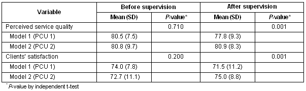 A total of 195 clients who were seeking care at each PCU during the study period completed the questionnaire before and after the intervention. The general characteristics of all participants are shown (Table 1). After supervision, the mean score for clients' perceived service quality among PCU 1 (model 1) decreased significantly (80.5 vs 77.8; p = 0.001). Similarly, the mean score for client satisfaction decreased significantly (74.0 vs 71.5; p = 0.006). PCU 2 (model 2), after supervision, the mean scores for clients' perceived service quality before and after supervision were almost the same (80.8 vs 80.9; p >0.05). In contrast, after supervision, the mean score for client satisfaction had increased statistically (72.7 vs 75.0; p = 0.013).