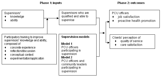 A quasi-experimental study was utilized with two different supervisory models over the six-month period, September 2003 to February 2004. In the first model, supervision was conducted by supervisors from district level with the full participation of health officers at tambon (sub-district) level. The second model was designed with the additional involvement of the community in the supervisory process. Prior to implementing the models, district supervisors attended a re-training course to enhance their supervisory knowledge and ability. This participatory training course was based on the existing literature as well as information obtained from interviews with 18 selected district level supervisors and supervisees. Participatory training referred to a continuous learning process, starting from experience or current activities, followed by analysis and conclusion, leading to operative planning implementation. This training consisted of two phases. The objectives of Phase 1 were to improve the knowledge and abilities of district level supervisors, to set plans for supervision in the PCU, and to develop supervisory instruments and documents (6 months). Phase 2 aimed to compare the results of the two supervisory models (6 months). The conceptual framework for the study is shown (Fig 1).