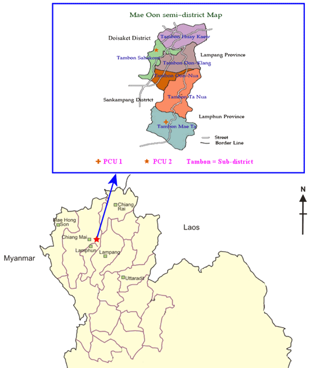 Figure 2: Location of two selected PCU in the study area, Mae Oon semi-district, Chiang Mai Province, northern Thailand.