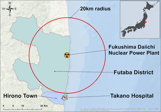 Figure 1: Geographical location of Takano Hospital and Fukushima Daiichi Nuclear Power Plant.