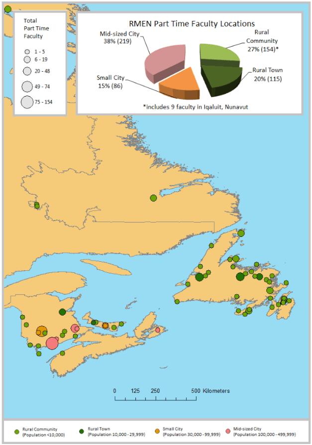 Figure 1: Map showing part time faculty locations outside of St. John’s and Halifax as of August 2015; symbol size indicates total number of part-time faculty at each location.