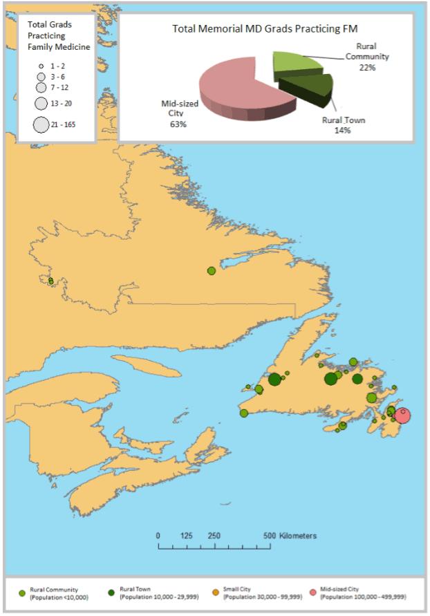 According to the Canadian Medical Directory, of all Memorial MDs practicing in Canada as of January 2015, 324 of 1584 (20.5%) were practicing in rural communities and rural towns. Of those who were known to be practicing FM anywhere in Canada, 172 of 517 (33.3%) were practicing in rural communities and rural towns.