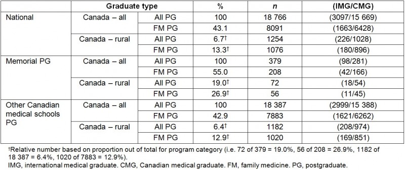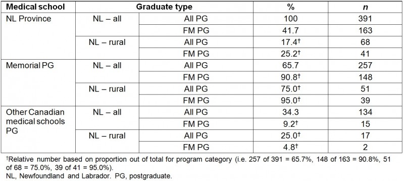 For the province of Newfoundland and Labrador, 65.7% of all practicing graduates from the same timelines did their PG training at Memorial and made up the majority of physicians for both rural and total number of practicing graduates as seen in Table 2.