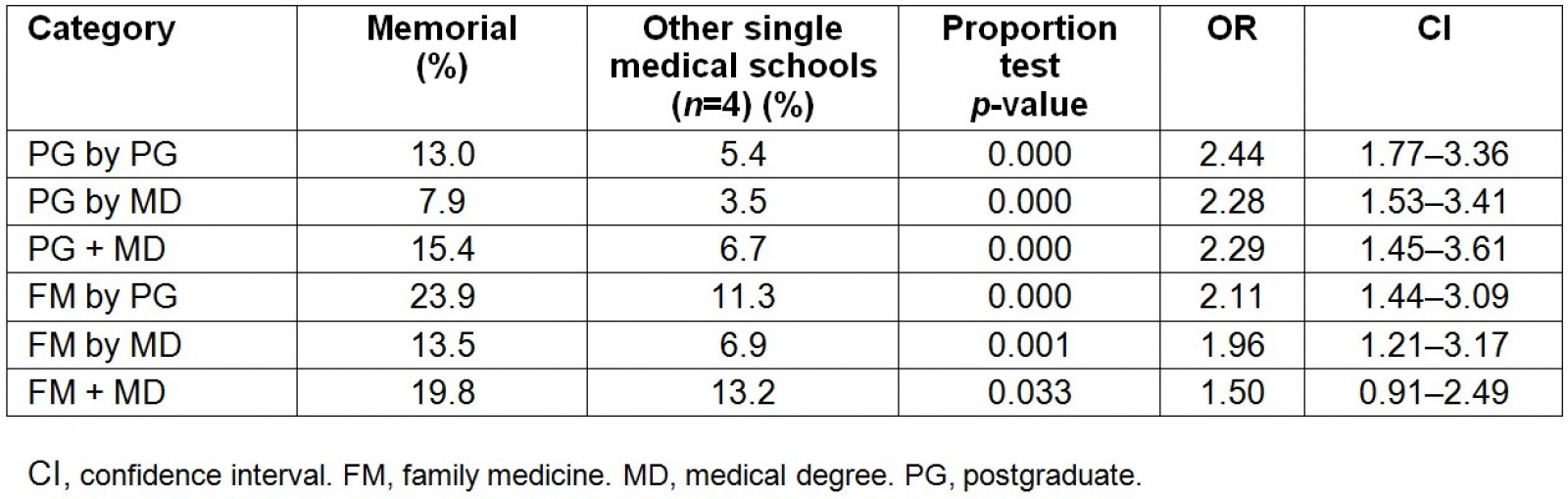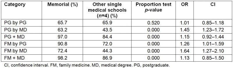 Table 3: Percentage and odds ratio (OR) out of total cohort in province for graduates practicing in the province who received their training in the same province – training by graduate type (Memorial vs other single medical schools (n=4))