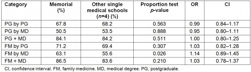 Table 5: Percentage and odds ratio (OR) for provincial graduate retention by graduate type (Memorial vs other single medical schools (n=4))