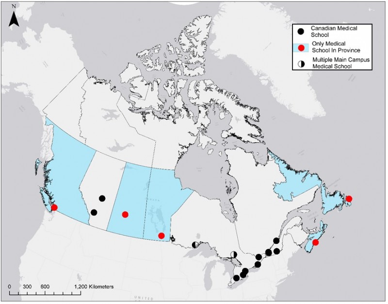 Canadian MD and PG Training Location: Canada has 17 medical schools that are unevenly distributed among its 10 provinces; the majority can be found in major population centres. Five of these seventeen Canadian medical schools are the only institution in their respective province (Fig2).