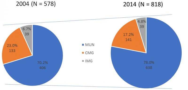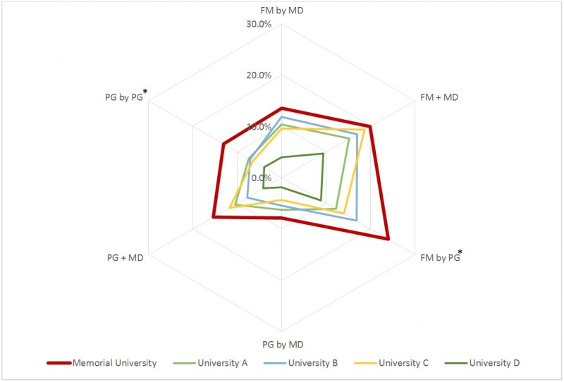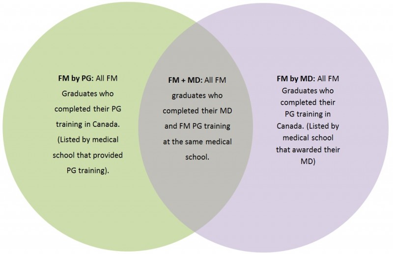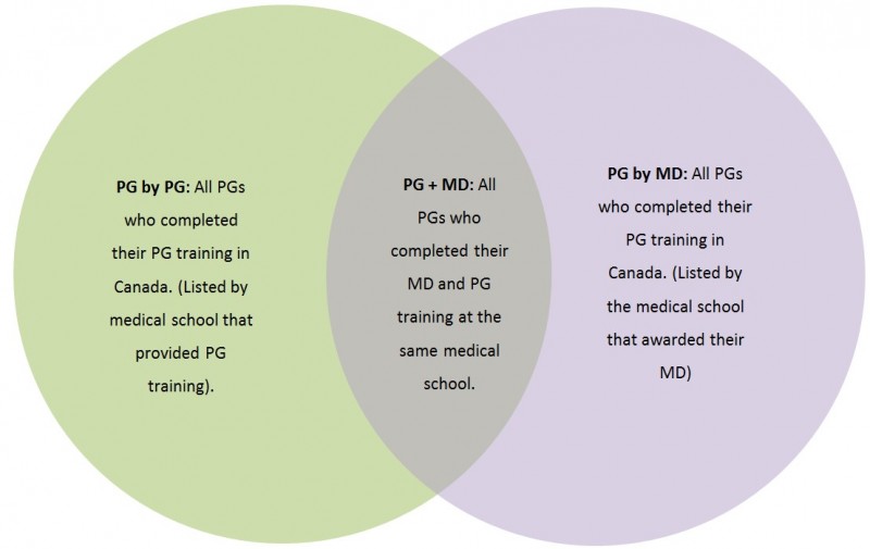 For the purpose of this study, MDs and PGs from every medical school were categorized into three groups based on the university they received their MD or their PG training or both their MD and PG training (Fig3). Using the same approach, the authors categorized FM graduates into the same categories (Fig4). IMGs who completed their PG training in Canada were also classified into the same three categories; however, for the PG by MD and FM by MD categories, they were listed as IMGs as their MD was completed outside of Canada.