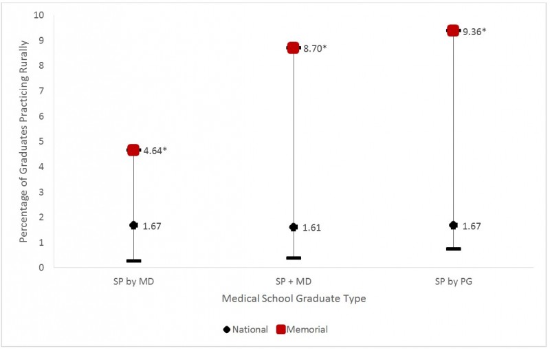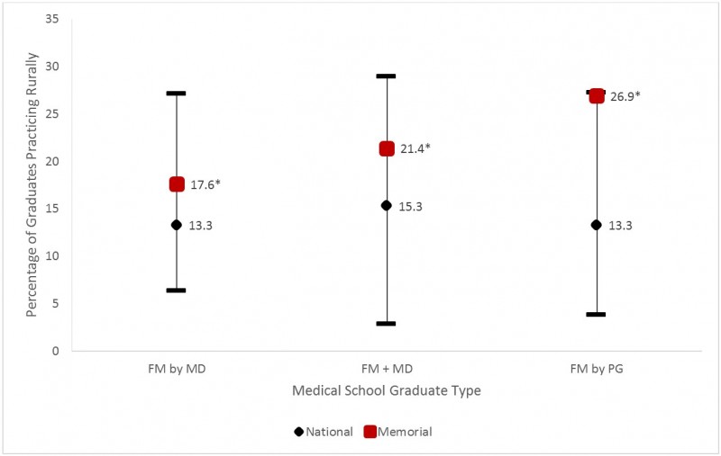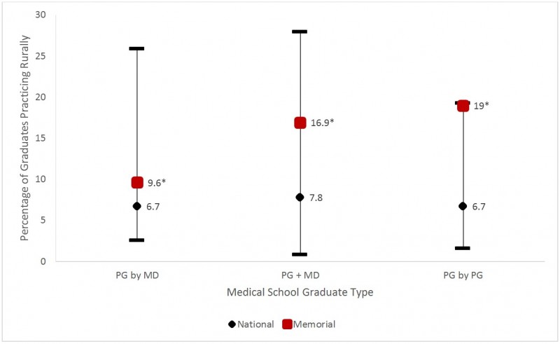 Based on analysis of CAPER data, the authors found significantly higher proportions of physicians practicing rurally for graduates who completed their MD and/or PG training at Memorial practice compared with graduates from other Canadian medical schools.
