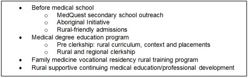 Memorial’s MD education and PG vocational residency training programs and CME are directed towards the province’s physician-resource needs including rural generalists, and to national physician-resource needs especially rural generalists. The main components of Memorial’s pathways to rural practice begin before admission to medical school and feature a rural focus throughout: MD education, Family Medicine (FM) PG residency training, and CME practice/teaching support. These are augmented by a student-led, faculty-supported Rural Medicine Interest Group (RMIG) that has been very active since its inception. The key educational interventions that are part of Memorial’s pathways to rural practice are listed in Box 1. Memorial’s comprehensive end-to-end pipeline/pathways to rural generalist practice is described and analyzed in more detail in the companion article: From pipelines to pathways: The Memorial experience in educating doctors for rural generalist practice25.