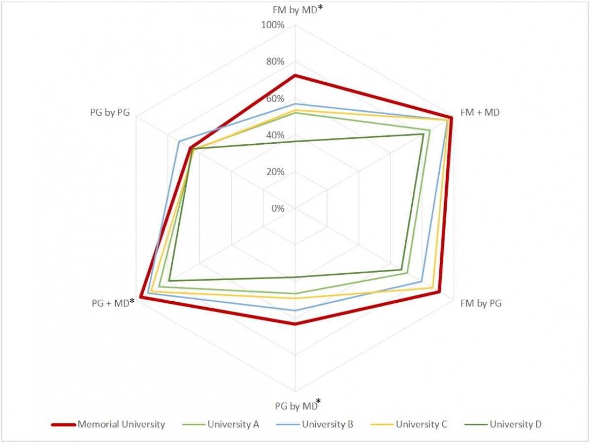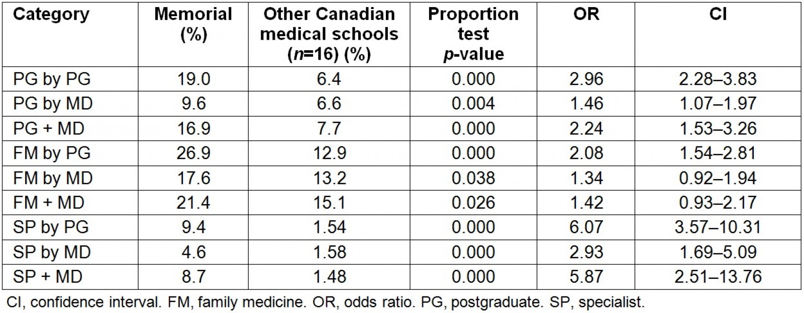 When considering specialists who practice rurally, Memorial is the best performing medical school for all categories as illustrated in Fig9 (values listed in Table 6). The two-sample proportion tests for each type of Memorial specialist graduate also indicated that each is significantly better than the national average for all categories (Table 6).
