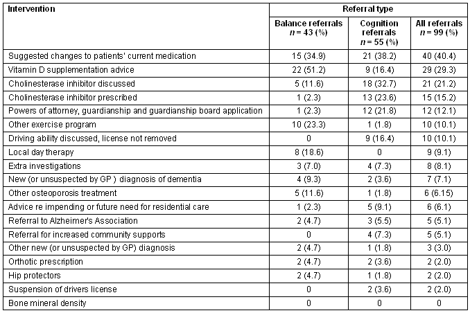 There were a total of 99 letters available for analysis out of the 115 patients seen by the EPN. Table 1 shows the recommendations made to the GP for patients referred for either balance problems or cognition problems, and for all referrals analysed extracted from available clinic letters. Letters were not available for clients who were seen in a residential care facility because the letter was hand-written in the resident's notes.