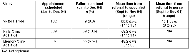 After the clinic was established, a demographic profile of clinic attendees and referral patterns were collected for the next 20 months. Clinical letters were audited to identify what services the clinic had provided to the attendees, including referrals to allied health services, prescription of cholinesterase inhibitors and osteoporosis treatment. After establishing the clinic we assessed patient access, by comparing 3 months of new referrals to the outreach clinic from the Fleurieu region to referrals to our urban based memory and falls clinic in the same period. Patient cancellations on the day of the clinic and failure to attend the appointment were also compared for the calendar year of 2004.