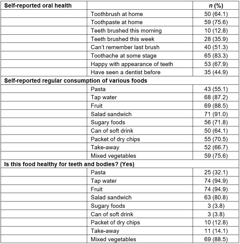 Of the 78 children who completed the survey, over a third (28; 35.9%) did not own a toothbrush and 19 (24.4%) did not use toothpaste. Only 10 (12.8%) children brushed their teeth in the morning when they answered the questionnaire and half (40; 51.3%) could not remember the last time they brushed their teeth (Table 2).