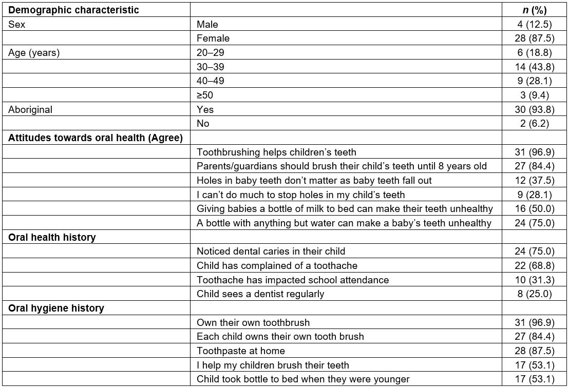 A total of 32 parents and/or guardians completed the oral health questionnaire (Table 3), with at least one parent/guardian for each child participating. Most parents/guardians were female (28; 87.5%); and the majority identified as Aboriginal (30; 93.8%).
