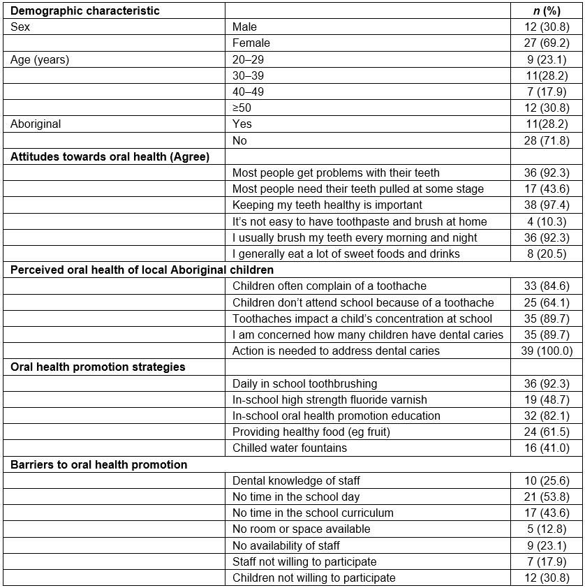 A total of 37 school staff and two community health workers completed the oral health questionnaire. This was a majority of the school staff and health workers employed in the local schools and community health centres at the time. School staff included school principals (n=3), teachers (n=19), administration staff (n=4) and learning support staff, including Aboriginal education officers (n=11). Eleven of the school staff identified themselves as Aboriginal.