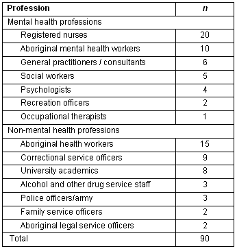 An important aspect of this symposium was the mix of delegates who contributed. Ninety delegates attended, 40 of whom were Indigenous. The symposium was well attended by delegates from Central Australia, Cape York, Sydney and throughout Queensland, some of whom were experts in this area and invited speakers. A range of non-government and government agencies were represented by delegates who came from a range of disciplines such as psychiatry, psychology, social work, Aboriginal health/mental health, nursing and other mental health support fields. Table one shows the breakdown of professions represented by symposium participants. This mix of participants resulted in discussions that encompassed many disciplines and emphasised the multidisciplinary nature of the conference theme: service capacity building.