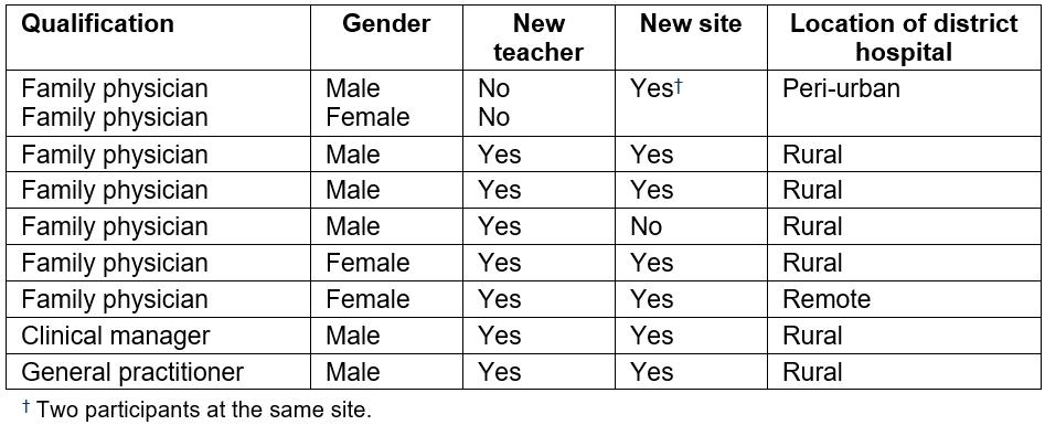 The setting for this research was district hospitals in South Africa where medical students spend five weeks doing a clinical rotation in rural health care. Sites were between 65 km and 1200 km from the medical school campus and its traditional tertiary academic teaching hospital. Of particular interest were clinicians who had recently taken on the role of clinical teacher, or clinicians who were working at sites newly used for clinical teaching. It was assumed that new sites would not necessarily have an established culture, history of or expertise in student teaching, or a developed community of pedagogic practice. Although the clinicians are not considered staff of the university, there is an expectation from both the medical school and the Department of Health that clinicians be involved in clinical training3. In this case, the authors were exploring their responsibilities with regards to clinical supervision. They also facilitate students’ quality improvement projects and home visits. Within the distributed training platform at the time, there were nine clinicians (seven of whom were family physicians) at eight different training sites who fulfilled the above criteria. All were approached and invited to participate in an interview and all consented to do so. Table 1 shows the demographic details for the participants.