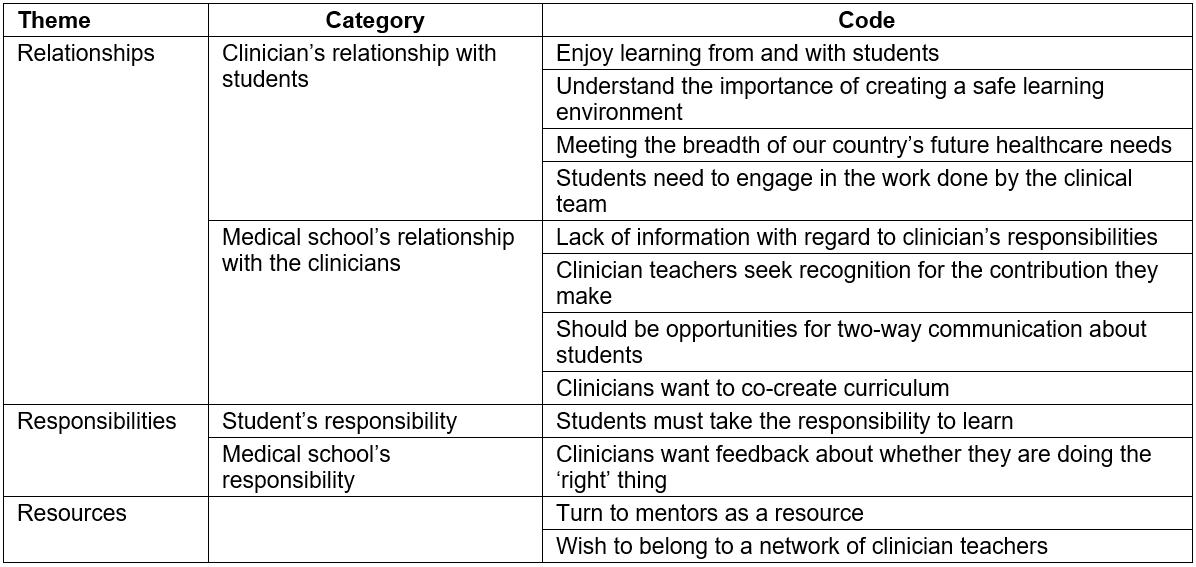 Three themes emerged during the analysis: relationships, responsibilities and resources. Table 2 presents the codes, grouped into categories and themes. The dominant theme concerned the relationships that the clinicians have with students, and those that they miss having with the medical school. The respondents recognised the student’s responsibility in learning, embraced their own responsibility for teaching and called on the medical school to fulfil its responsibility to support them in this delegated task. The resource that the clinicians would turn to most often was trusted colleagues.
