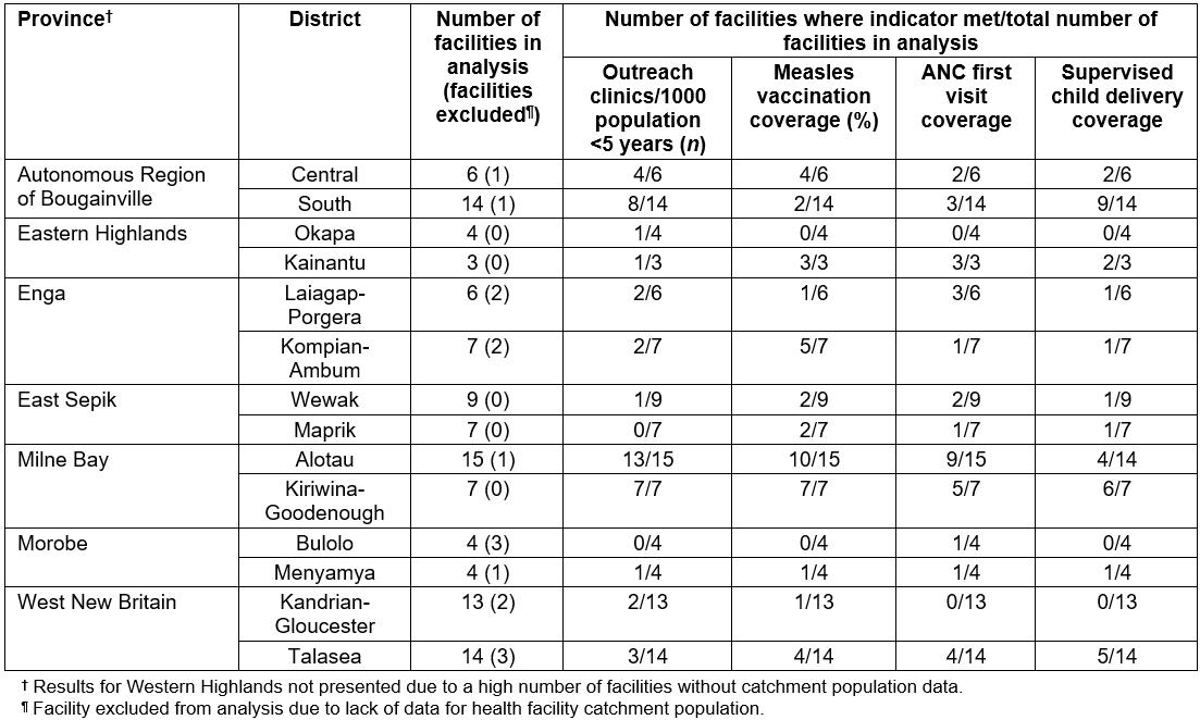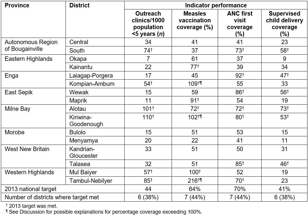 For brevity, only four of the most relevant indicators from the performance assessment framework are presented, covering health system access, and maternal and child health. The indicators presented are outreach clinics per 100 children aged less than 5 years, measles vaccination coverage at 12 months of age, ANC1 coverage and supervised delivery coverage. The performance indicators varied widely across the 16 districts (Tables 1,2). Both districts in Milne Bay met all four targets for the indicators presented. Conversely, no targets were met in Central Region in the Autonomous Region of Bougainville, Kandrian-Gloucester in West New Britain and both Bulolo and Menyamya in Morobe.