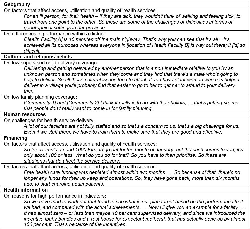 All provincial health advisors or provincial health authority chief executive officers (interviewees) from provinces covered by the project participated in the interviews. The interviewees (n=8) had been working in health for 12–43 years with a majority of that time working in the province in PNG where they were currently employed. Together they represented all of the eight provinces. The responses presented here relate to discussion of all indicators presented: outpatients per person per year, outreach clinics per 1000 children aged less than 5 years, measles immunisation coverage at 9–11 months, family planning couple years protection per 1000 women of reproductive age, proportion of pregnant women who had at least one antenatal care visit and proportion of pregnant women who had a supervised delivery.