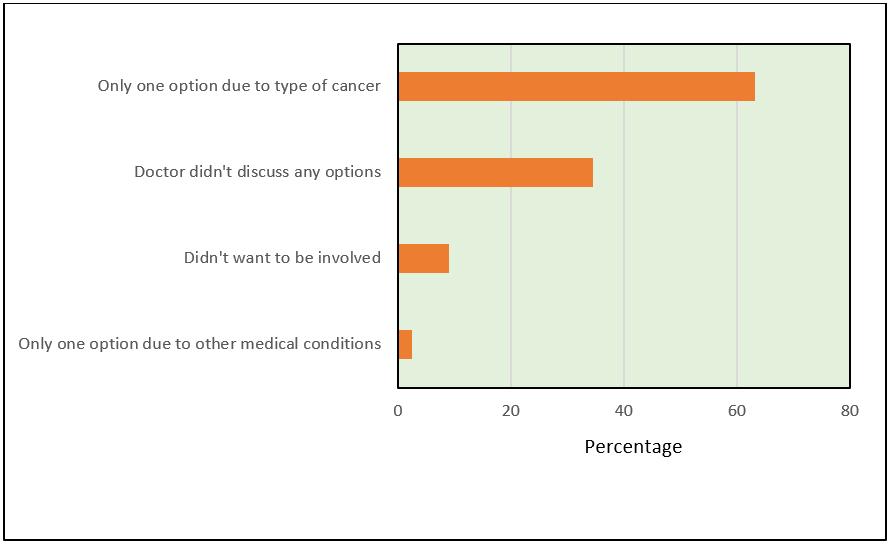 Approximately 15% of women indicated they were not involved in deciding what treatments they would have. The most common responses for why they were not involved was that they did not have options due to their type of breast cancer (63.1%) or that their doctor did not discuss any options with them (34.4%) (Fig1). Responses were similar for rural and metropolitan women and across age groups.