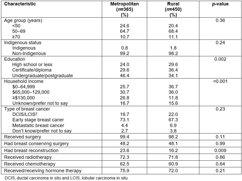 In all, 6662 women were emailed regarding the online survey, with 1046 (15.7%) initially consenting to participate. Of those, 815 (77.9%) completed all survey items. Table 1 provides an overview of survey participants. Mean age was 57 years (range 29–83 years) and 1.4% identified as Aboriginal or Torres Strait Islander (hereafter referred to respectfully as ‘Indigenous’). Approximately 45% lived in a metropolitan location. Of those living in rural areas, just under one-third (31.9%) were from an inner regional area, 20.1% from outer regional areas and 3.2% (n=26) were from remote or very remote locations. Just over one-third were educated at an undergraduate or postgraduate level (39.0%) and 32.8% had a diploma or certificate. Education at an under- or postgraduate level was more common amongst metropolitan women (p=0.002). About one-third (31.8%) of all women reported an annual household income of less than $65,000 per annum, with this being more frequently observed for rural women (p<0.001). In relation to breast cancer diagnosis, the majority of women reported being diagnosed with early stage breast cancer (69.9%), about 1 in 5 reported a diagnosis of DCIS or LCIS and 5.8% had metastatic breast cancer with these proportions being similar amongst rural and metropolitan women. Nearly all women reported having some form of surgery (98.8%), with just under three-quarters reporting they had radiotherapy; 61.6% had chemotherapy and 73.7% had or were currently receiving hormone therapy. There were no significant differences observed according to residential location. Overall, just under 1 in 5 women (19.5%) indicated they had undergone breast reconstruction, with this being significantly more common amongst metropolitan compared to rural women (p=0.009).