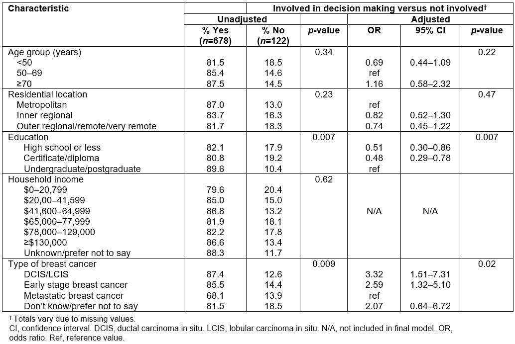 Table 2: Factors associated with treatment decision-making amongst a sample of women with breast cancer in Australia