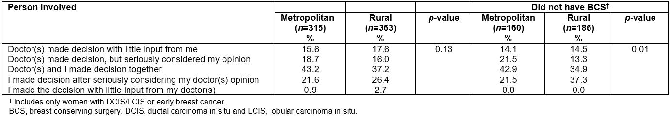 Table 3: Who was involved in making treatment decision(s) amongst metropolitan and rural women diagnosed with breast cancer