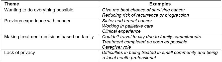 Table 4 shows the component themes identified in the qualitative interviews. Many participants discussed wanting to do all treatment available in order to give themselves the best chance of surviving their breast cancer and reducing any risk of the disease recurring in the future. Some participants indicated that their experiences with cancer, either within the family or as a health professional, influenced their decision-making. Participants also identified the need to have treatment locally to avoid time away from family. This was particularly a concern for participants who were the main caregiver. One participant, rather than have treatment locally, elected to have treatment away from her community due to concerns about her own privacy.