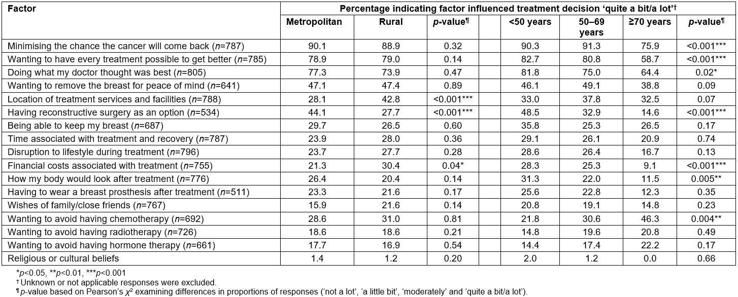 The aim of this present study was to examine factors that influence treatment decisions of women with breast cancer, with a particular focus on identifying whether there are differences between rural (including regional, remote and very remote) and metropolitan women.