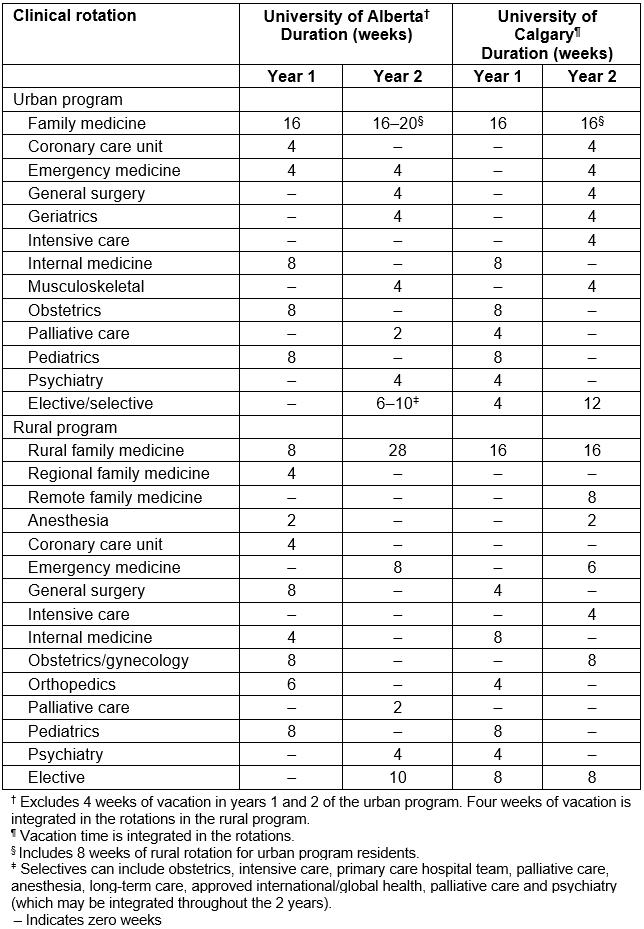 The family medicine residency programs at the University of Alberta and the University of Calgary are each 2 years in duration and offer training in urban and rural/regional settings. In 2000, the two universities established dedicated rural streams that, at the time of this study, were based in four regional centers in Alberta (Lethbridge and Medicine Hat for the Rural Alberta South (RAS) program at the University of Calgary; Red Deer and Grande Prairie for the Rural Alberta North (RAN) program at the University of Alberta). Residents in the RAN and RAS programs live in the regional settings in which they are based and also spend a considerable amount of time in smaller rural and remote communities for clinical experience. Residents in the urban program do clinical rotations in the cities of Calgary or Edmonton but are also required to spend a minimum of 2 months in a rural community in the second year of training. The requirement for a 2-month rural rotation was mandated for the first time by the College of Family Physicians of Canada in 200516. Table 1 outlines the 2-year clinical curriculum for both the rural and urban programs during the time the study cohort went through the residency program. Although the location of training differs, the rural and urban programs share a similar Triple C competency-based curriculum based on the requirements of the CFPC and focused on Comprehensive care, Continuity, and Centred in family medicine17. Generally, rural residents are exposed to more generalist physicians from many disciplines in regional hospitals with few specialty residents, while urban residents undertake hospital rotations in tertiary care hospitals under the supervision of specialists and their residents. For both programs, family medicine clinical experience is based in the community.