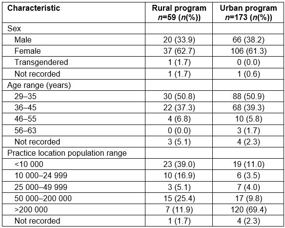 The overall survey response rate was 47.2% (307/651). Of the total respondents, 173 were categorized as urban program graduates and 59 as rural program graduates. Within each of the two universities, the proportion of rural and urban respondents was equivalent. Excluded from analysis were two respondents who did not record their program stream and 73 who entered residency training through the AIMG program or were transfers. Limitations of the questionnaire did not enable residents who entered residency training through the AIMG program to be classified as either rural or urban program graduates.
