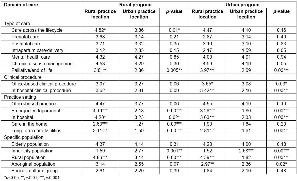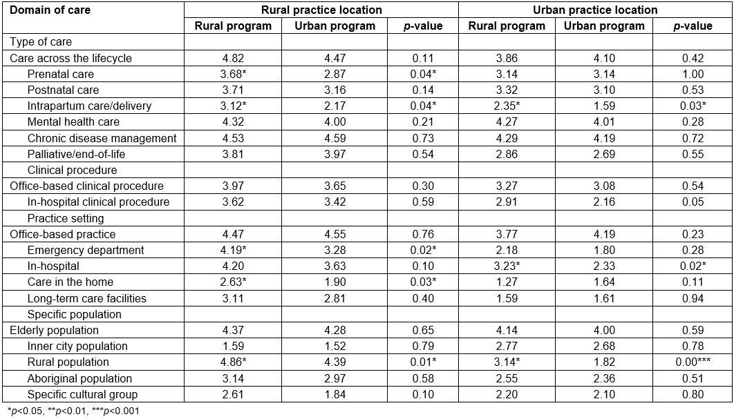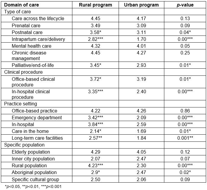 Comparison of each item within the four domains of care revealed that rural program graduates had significantly (p<0.05) higher overall mean scores than urban program graduates for providing postnatal care, intrapartum care/deliveries, palliative/end-of-life care, office-based clinical procedures, in-hospital clinical procedures, providing emergency care, in-hospital care, home visits, long-term care, and caring for rural or Aboriginal populations (Table 3).