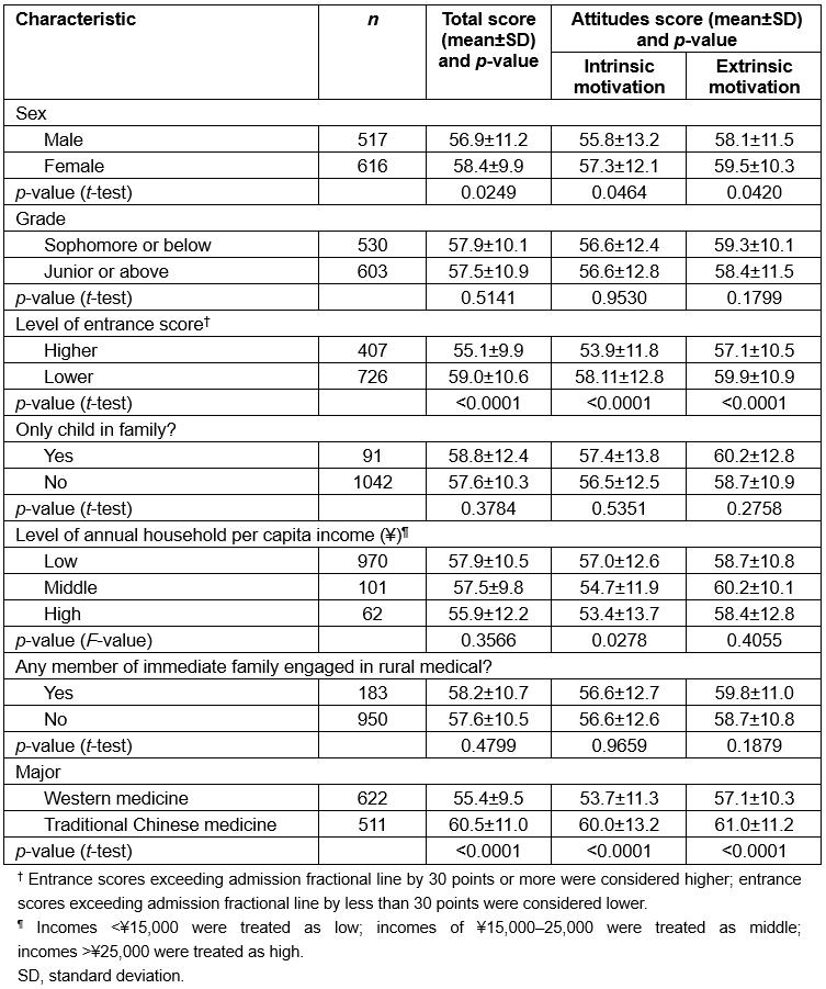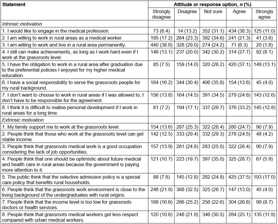 Further analysis of factors influencing the preference of undergraduates’ independent decisions, including demographics, course majors, family backgrounds and entrance scores, was conducted. All statements of motives were transformed from survey questions. For the external performance of motivations, attitudes were represented by scoring answers using five-point Likert scale categories (‘strongly disagree’, ‘disagree’, ‘not sure’, ‘agree’, ‘strongly agree’). Responses were assigned a score from 5 to 1 or from 1 to 5 based on the degree of positivity about the content of each answer contributing to rural medical career choice.