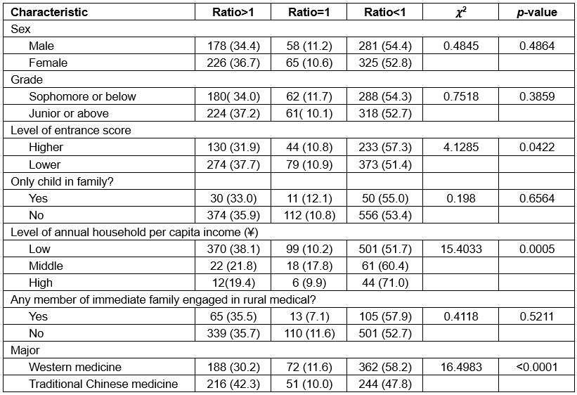 The results of single-factor analysis suggested that the undergraduates who had lower entrance scores, low level of family income and majored in TCM likely had a higher relative ratio (>1) compared with those who had higher entrance scores, high level of family income and majored in WM (p<0.05; Table 3).