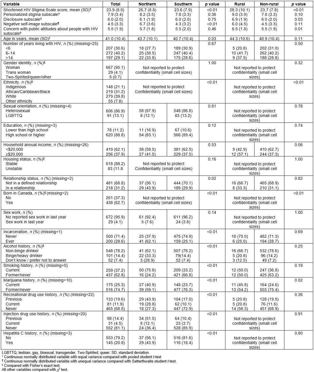 In comparison to participants from southern regions, participants from northern regions were older, and more likely to identify as Indigenous, be in a defined relationship, be born in Canada, have a history of incarceration, report substance use (alcohol, smoking, marijuana, recreational drug use and IDU) and be hepatitis C-co-infected. In comparison to participants from non-rural regions, participants from rural regions were more likely to identify as Indigenous, be born in Canada and report marijuana use.
