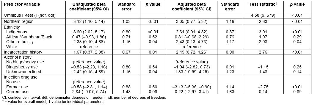 In univariate analysis, living in a northern region was significantly associated with higher stigma scores (Table 2). Covariates that led to a >10% change from the unadjusted beta-coefficient of northern were ethnicity, incarceration history, alcohol history and IDU. After adjusting for these potential confounders, northern region of residence remained significantly associated with a higher stigma score. A total of four outliers were identified and a sensitivity analysis excluding these outliers did not significantly alter the results. With these other factors constant, living in a northern region was associated with a 3.05 (95% CI 0.77, 5.32) point increase in the mean stigma score. In the multivariable model, Indigenous ethnicity, other ethnicity and history of incarceration were also significantly associated with higher stigma scores. Former injection drug use was associated with lower stigma scores.