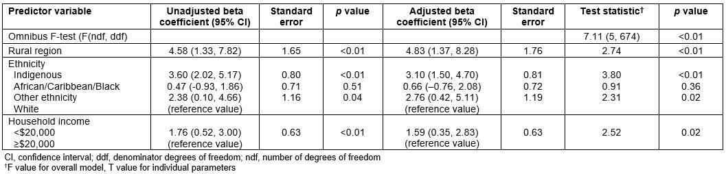 In univariate analysis, living in a rural region was significantly associated with higher stigma scores (Table 3). Covariates that led to a >10% change from the unadjusted beta-coefficient of northern were ethnicity and household income. After adjusting for these potential confounders, rural region of residence remained significantly associated with a higher stigma score. After excluding four identified outliers in a sensitivity analysis, there was no significant change in the findings. With these other factors constant, living in a rural region was associated with a 4.83 (95% CI: 1.37, 8.28) point increase in the mean stigma score. In the multivariable model, Indigenous ethnicity, other ethnicity and household income <$20,000 were also significantly associated with higher stigma scores.