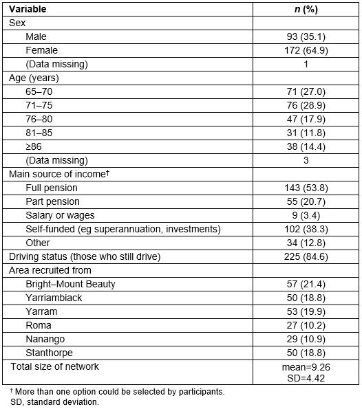 A community saturation approach46 was utilised to recruit a diverse sample of participants in relation to age, health status and location. The research team visited communities within the six case study sites in person to circulate information and elicit interest in the study. By working with health and aged care agency partners, the study endeavoured to include more frail and isolated older people. Inclusion criteria for the sample population was those aged 65 years or more and living within one of the six selected rural communities. Older people living in residential care or experiencing dementia were excluded. Study materials for participant recruitment were developed, including a flyer and an expression of interest postcard. A 1800 number was created and included in the study material to allow participants to contact staff toll-free. A detailed information sheet was supplied to all participants. A total of 266 older people from six rural townships within Australia took part in the current study. The sample consisted of 93 men and 172 women aged 63–100 years (mean=75.92, standard deviation (SD)=7.77), with 1.1% identifying as Aboriginal or Torres Strait Islander.