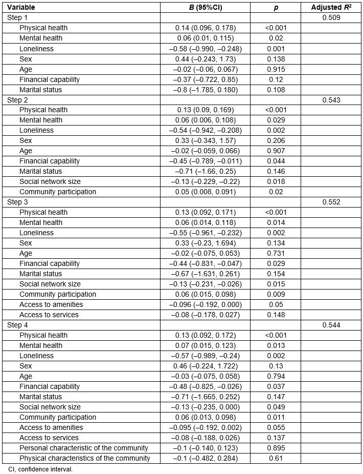 The hierarchical regression revealed that the variables that contributed independently and significantly to perceived wellness were physical health, mental health, loneliness, financial capability, social network size and community participation.