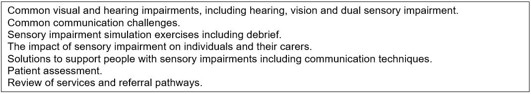 Sensory training workshops were held with community staff in five localities in the Western Isles of Scotland and were facilitated by sensory services staff (GM, JG) with expertise in sensory training and supporting people with sensory impairment. The duration of each workshop was 3–4 hours. Workshop content included simulation practice, information on assessment and referral pathways (box 1). The workshops were interactive and simulation scenarios gave participants the opportunity to experience examples of sight and hearing impairments and their impact on aspects of daily living. Simulation is a ‘technology to replace or amplify real experiences with guided experiences that evoke or replicate substantial aspects of the real world in a fully interactive manner31. Low-tech equipment, everyday tasks and post-simulation debriefing32,33 formed the basis of simulation in the workshops. For example, wearing sight impairment simulation spectacles, participants attempted to perform simple everyday tasks such as filling out forms, opening and closing clothing buttons and managing medication.