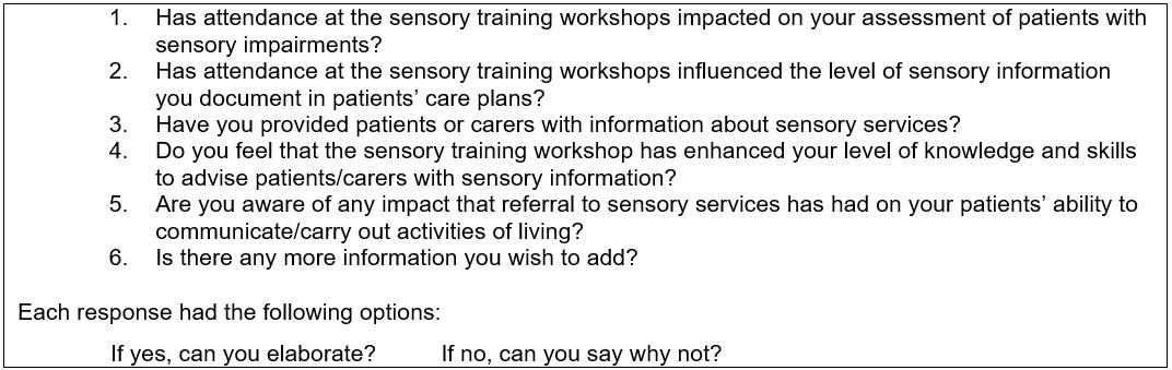 Data for this project were collected in three phases. In phase 1, pre- and post-workshop questionnaires assessed participants’ perceptions of workshop participation and knowledge, confidence, and awareness of sensory services including referral processes to support people with sensory impairment. Participants who attended the sensory workshops (n=41) were invited to complete the questionnaires and to rate their level of knowledge on three specific areas – hearing impairment, sight impairment and referral mechanisms – on a five-point Likert scale from 1 (low) to 5 (high). There were opportunities for free-text responses about the experience of workshop participation. In phase 2, a postal questionnaire (box 2), which focused on all levels of Kirkpatrick and Kirkpatrick’s hierarchy29, was sent to all participants 3 months post-workshop to gain their views of the longer term impact of workshop participation on their practice. Open-text responses were invited from participants about any changes with their approach to communication, assessment, information provision and referral advice. In phase 3, a focus group interview was conducted with a sample of participants, 6 months post-workshop, to elicit the longer term impact of participating and perceptions of referral processes, including an appraisal of barriers or facilitators. The interview was audio-recorded and transcribed verbatim.