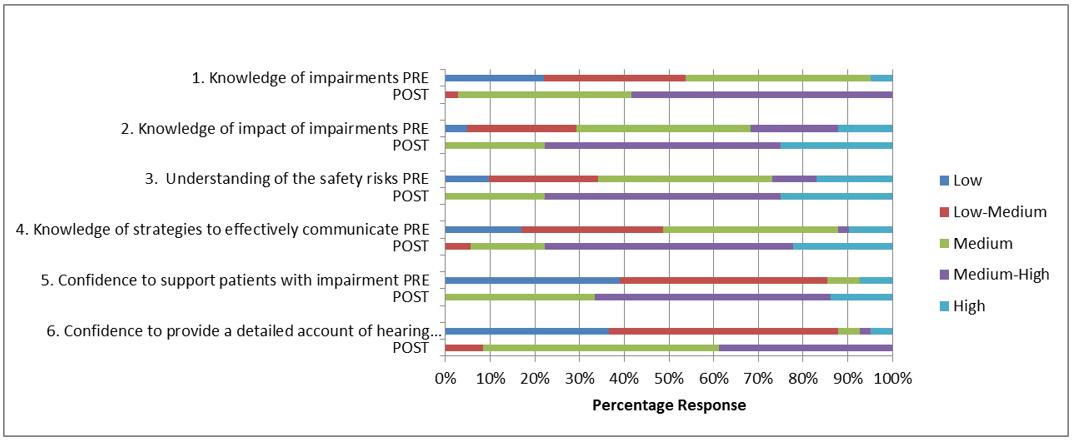 The majority of postal respondents (n=17) indicated that documentation of patients’ sensory impairment, use of hearing aids and other assistive devices and specific communication strategies employed had improved. One participant who indicated that practice had remained unchanged had not come across a patient with sensory impairment since attending the workshop.
