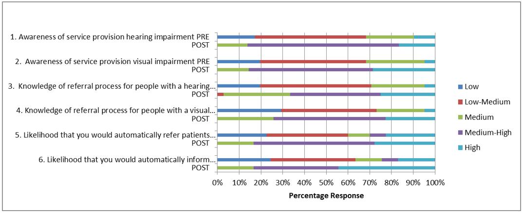 Outcome and referral to sensory services: The final stage of the hierarchy provided evidence of outcome and in particular whether participants were more likely to refer patients to sensory services. Awareness of sensory service provision increased from four participants (9.8%) rating their knowledge for hearing services as medium–high to high pre-workshop to 31 (86.3%) post-workshop and two participants (2.9%) rating their knowledge of visual services as medium–high to high pre-workshop to 30 (85.7%) respectively (Table 3). The likelihood that participants pre-workshop would refer patients with either a hearing or visual impairment for more specialist care was low with only 12 participants (29.0%) stating there was a medium–high or high chance of this happening. This increased to 30 (83.4%) after the workshop. Automatic referral to sensory services increased from 10 participants (24.4%) pre-workshop to 30 (83.3%) post-workshop (Table 3). Most participants felt they were in a better position to advise patients and others about service availability: