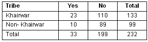 The prevalence of infertility among Khairwars and non-Khairwars in the study area is shown (Table 1). Out of 232 currently married women, approximately 33 (14.2%) of the interviewed couples were classified as infertile. The sex ratio was 1053 (female/1000 male) in the Khairwars and 882/1000 in non-Khairwars. Among the Khairwars, 23 couples (17.2%) were infertile; while 10 (10%) of non-Khairwars couples were infertile. The infertility was significantly higher among Khairwars than non-Khairwars.