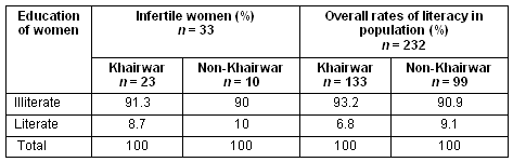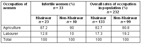 The data in Tables 2 and 3 demonstrate that while infertile women in this region are more likely to be illiterate and employed in agriculture, this merely represents the overall population norms for both Khairwar and non-Khairwar women.