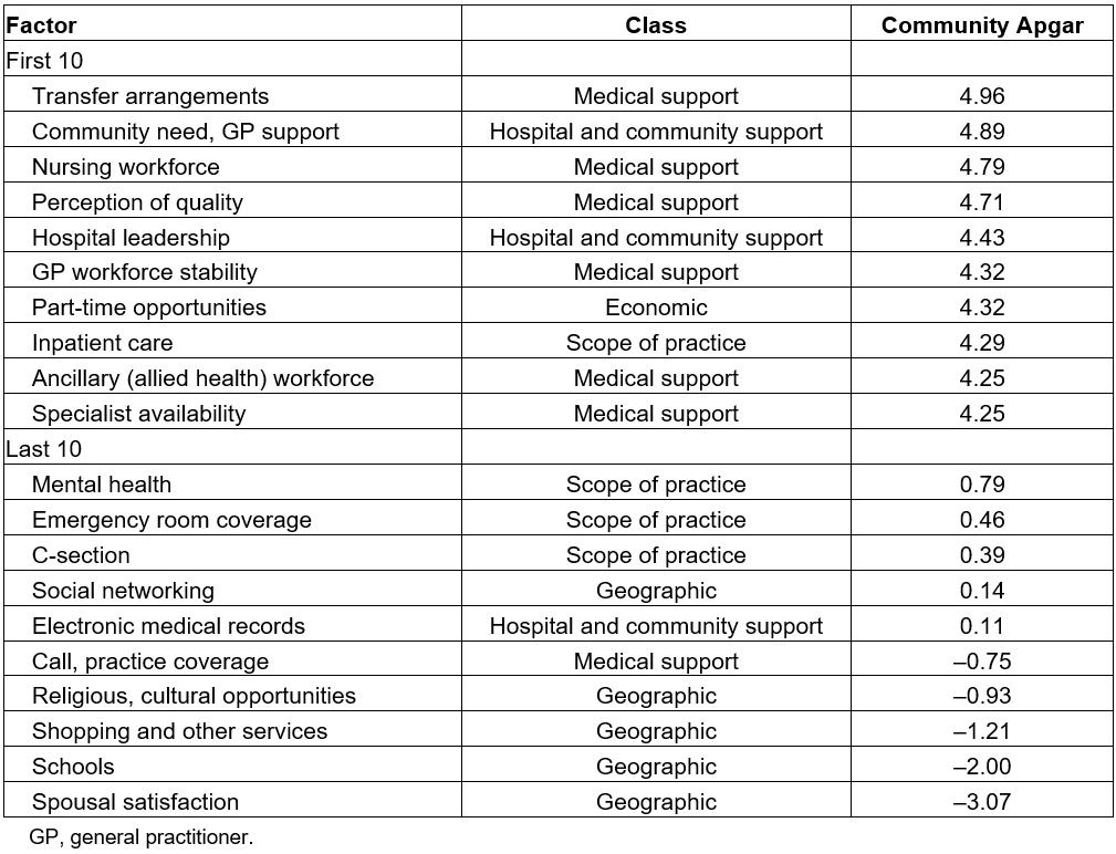 As identified by the respondents, the major advantages were mainly associated with the classes of medical support (transfer arrangements, nursing workforce, perception of quality, ancillary staff workforce and general practitioner workforce stability), hospital and community support (hospital leadership, community need/general practitioner support) and economic factors (part-time opportunities and income guarantee).