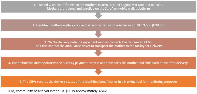 In June 2013, M-PESA Foundation launched a project aimed at improving maternal and newborn health outcomes in Samburu, Kenya, where the maternal mortality rate is 360 per 100 000 live births8. The project was conducted in partnership with PharmAccess Foundation, Safaricom, AMREF Flying Doctors and the Ministry of Health of Kenya through the Samburu County Health Management Team. A baseline study among 385 women and girls aged 15–49 years was carried out to assess the status of utilization of maternal healthcare services and facility deliveries, the role of community units in promoting maternal health, health worker training gaps and mobile phone availability (Samburu Maternal Neonatal Health Project Phase II baseline report, unpublished, 9 November 2015). The survey established that home deliveries were common if not the norm (ie 66% of the sampled respondents). Those who went to hospital mainly did so because of complications during delivery. Distance to the facility was the biggest barrier to facility delivery, reported by 64% of the respondents. Ownership of mobile phones was reported by 72% of respondents across three sub-counties in Samburu. To address the poor physical access to health facilities, PharmAccess Foundation tested the use of mobile money-based transport vouchers to pay for transport to the health facility. The vouchers were implemented using the Safaricom closed-loop wallet, Surepay. Surepay is built on top of the M-PESA mobile money transfer system. It allows funds to be placed under restrictions on where and how the money can be used. The experiment was carried out in two remote areas of Samburu County: Barsaloi and Suguta Mar Mar. The transport voucher was to be used for ambulance transport services to the health facility.