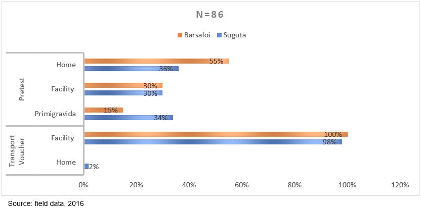The objectives of the experiment were first to test if facilitation of transport to healthcare facilities would result in increased numbers of enrolled mothers opting for skilled delivery at a health facility, as opposed to delivery at home. The second objective was to investigate the technical usability of the Surepay wallet as a transport voucher, and the third to identify user experience.